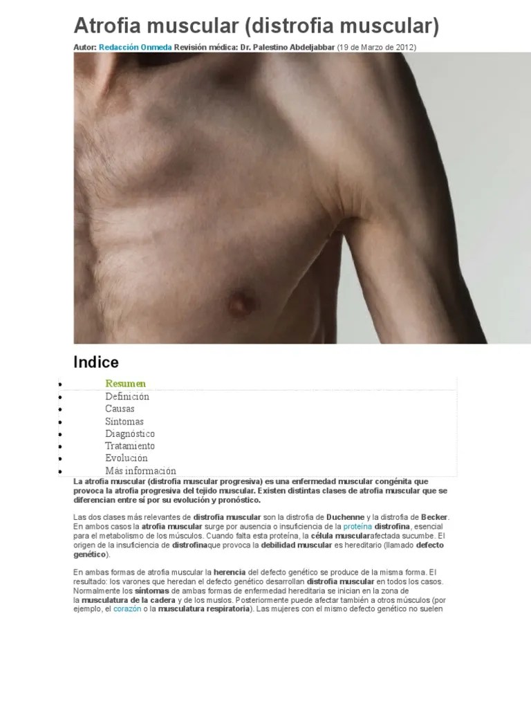 Las causas que hacen originar al problema que conocemos como la atrofia muscular pueden variar dependiendo del tipo de atrofia que se está tratando, es decir, en la actualidad se han determinado una clasificación que hace énfasis en tres tipos de atrofia muscular, los cuales se les conoce como la patológica, psicológica y finalmente se ubica la atrofia muscular neurogénica. 11/03/2019 · dentre os sintomas da doença estão: La atrofia muscular o perdida de musculo es cuando los músculos se atrofian.